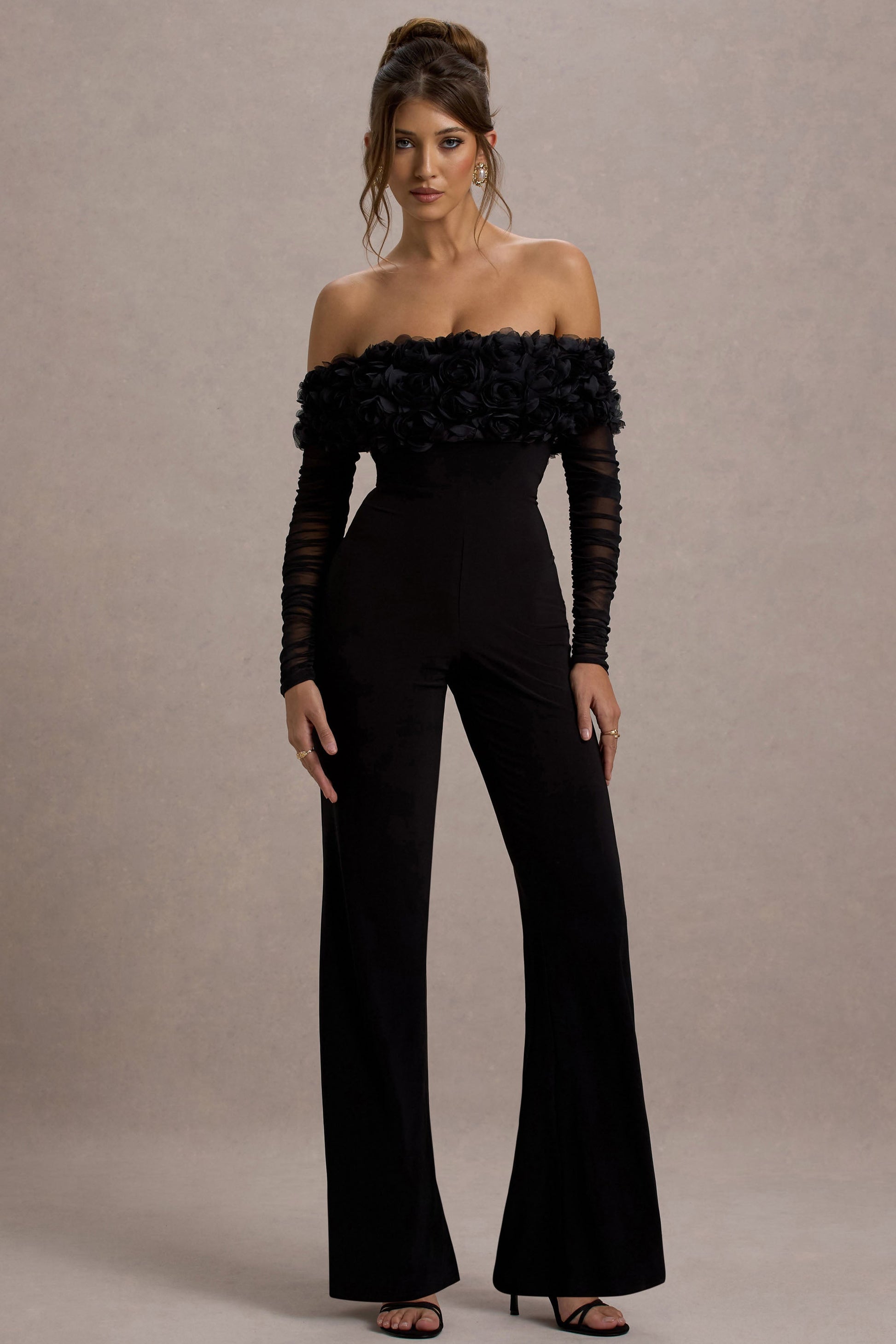 Celebrate | Black Bardot Long-Sleeved Flared-Leg Jumpsuit With Flowers